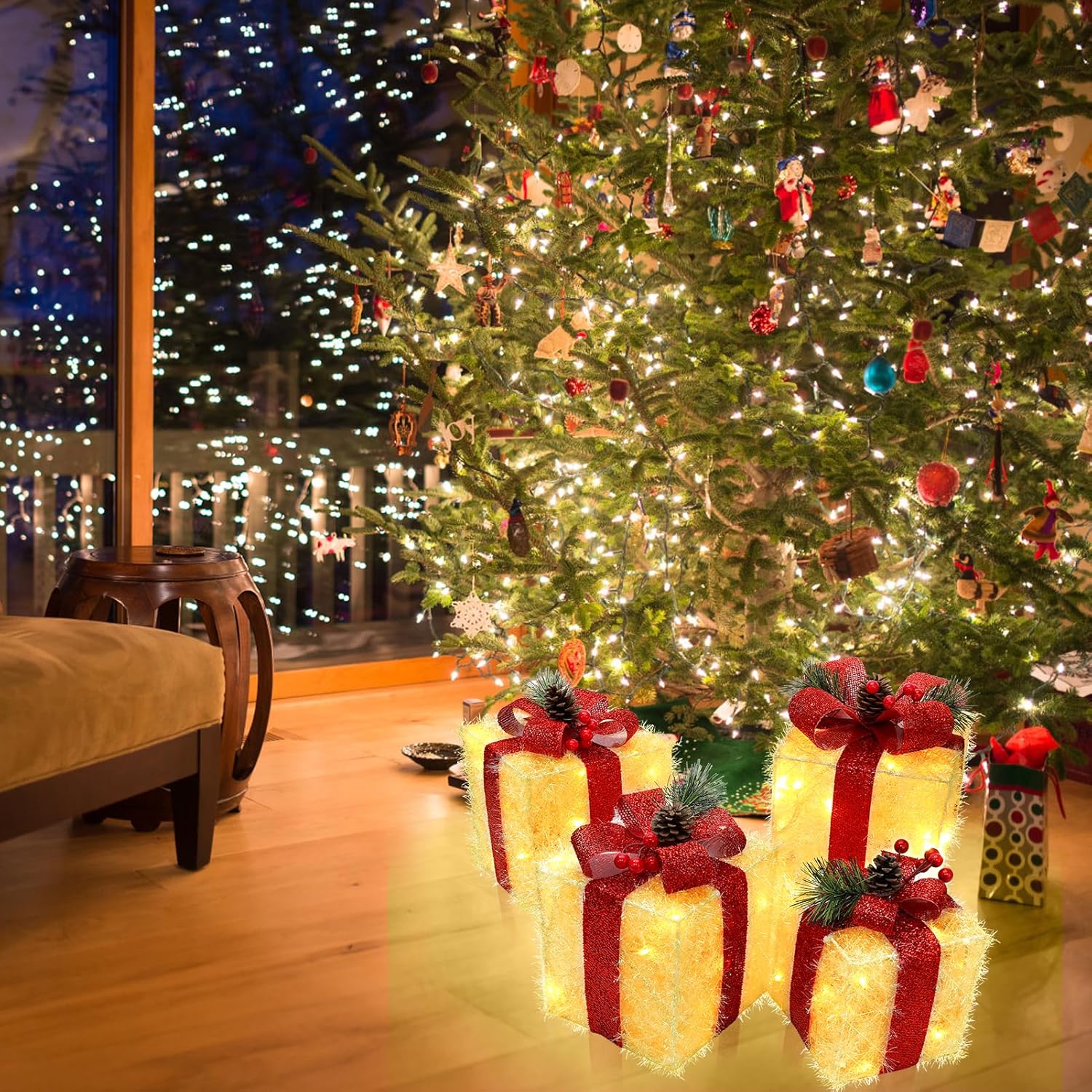 Exquisite Design: Our Christmas lighted gift boxes are decorated with pine cones, pine needles, and cute bows, together with 80 LED string lights to make your home even more dazzling. Plug in the power, the lights just emit the amount of bright, and the ribbon decorations on the top add a delightful touch.