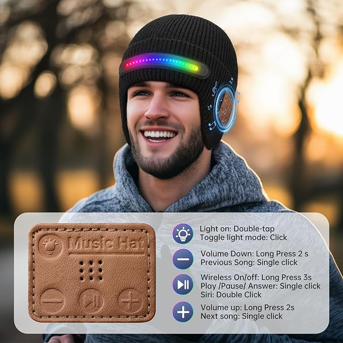 【All-Day Cozy Comfort】Crafted from premium acrylic fabric, this LED bluetooth beanie hat provides exceptional warmth and breathability for all-day comfort. Its elastic, one-size-fits-most design ensures a snug fit for men and women, making it the ideal companion for hiking, camping, or any outdoor work. 【Upgraded Bluetooth 5.4 Function】The Bluetooth beanie pairs instantly with any device and maintains a stable, continuous connection up to 33 feet. Featuring built-in stereo speakers and a microphone, it delivers clear sound for music and reliable hands-free calling, enjoy the freedom of wireless music and calls. 【Extended Runtime Beanie】The bluetooth beanie headphone hat with light is equipped with a convenient Type-C charging interface. It achieves a full charge in just 1.5-2 hours, delivering up to 10-15 hours of talk/music time or 4-8 hours of continuous LED light. For care, the beanie can be hand-washed at or below 30°C, provided the Bluetooth module is removed first (the light bar does not need to be disassembled). 【LED Winter Hat with Wide-Angle Light】 This rechargeable headlamp beanie is equipped with 20 LED beads that deliver 230° of wide-angle illumination. It features 5 distinct lighting modes for various needs: Music Rhythm, Breathing Color Change, Single Color, Multi-Color Gradient, and Single Color Gradient. You can effortlessly cycle through all modes for the perfect lighting. 【Perfect Gift for Him & Her】The Colorful lights beanie hat masterfully combines the fashion of a classic beanie with integrated headphones and a 230° headlamp. Delivering warmth with a comfortable, lightweight, and washable design, it's the perfect gift for men, women, and teens on occasions like Christmas, Thanksgiving, or birthdays.
